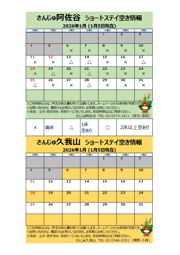 上記につきましては、居宅介護支援事業所へお知らせしておりますが、その他ご不明な点などございましたら、さんじゅ阿佐谷・さんじゅ久我山の生活相談員までお問い合わせください。