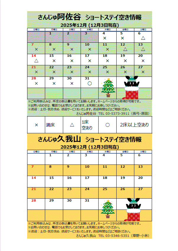 ★12/3更新★ショートステイの空き状況をお知らせします。