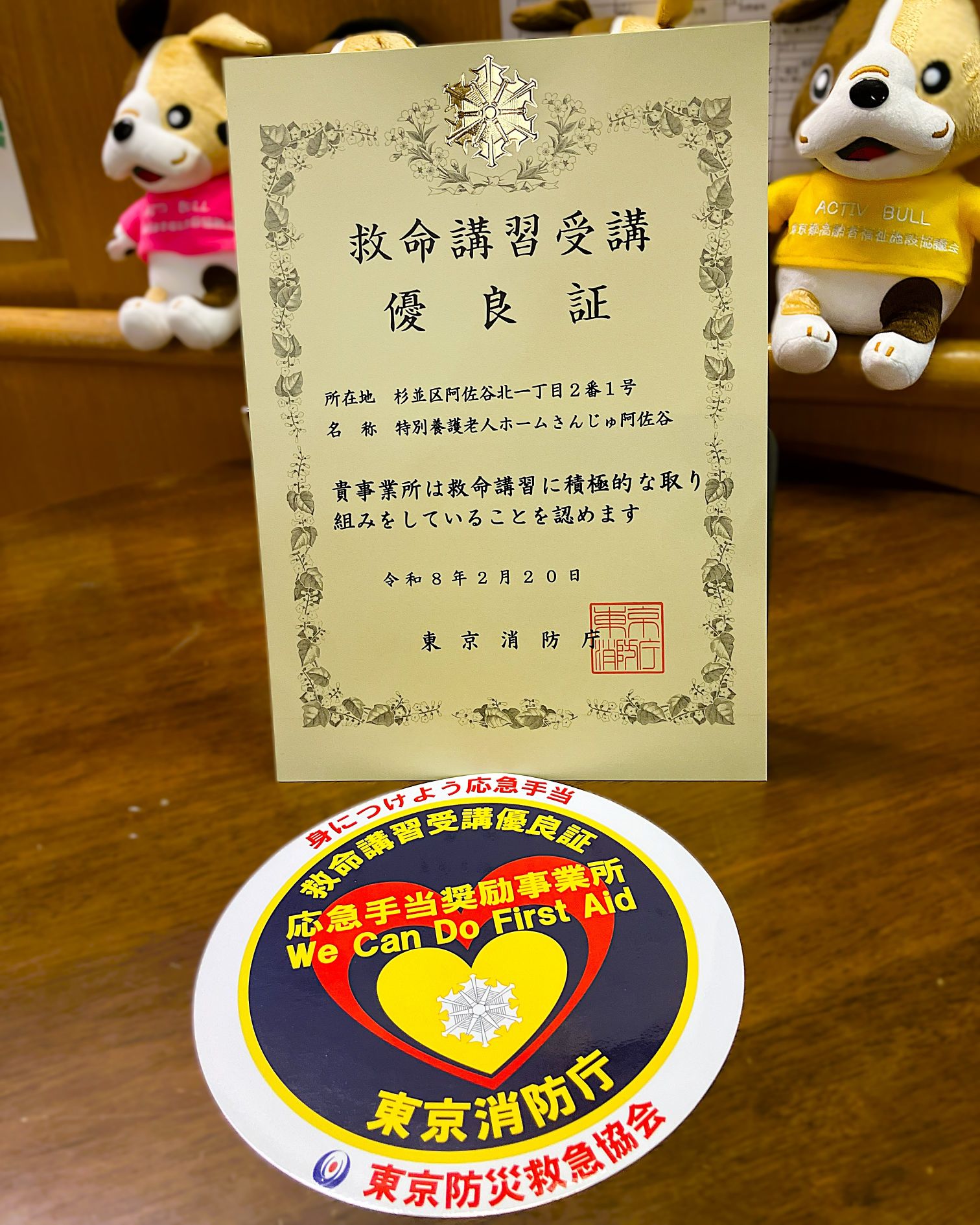 先日、東京消防庁より「救命講習受講優良証」をいただきました。