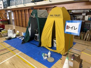 体育館の中では防災倉庫の備品や災害時用のトイレのことやテント設置などの説明がありました。